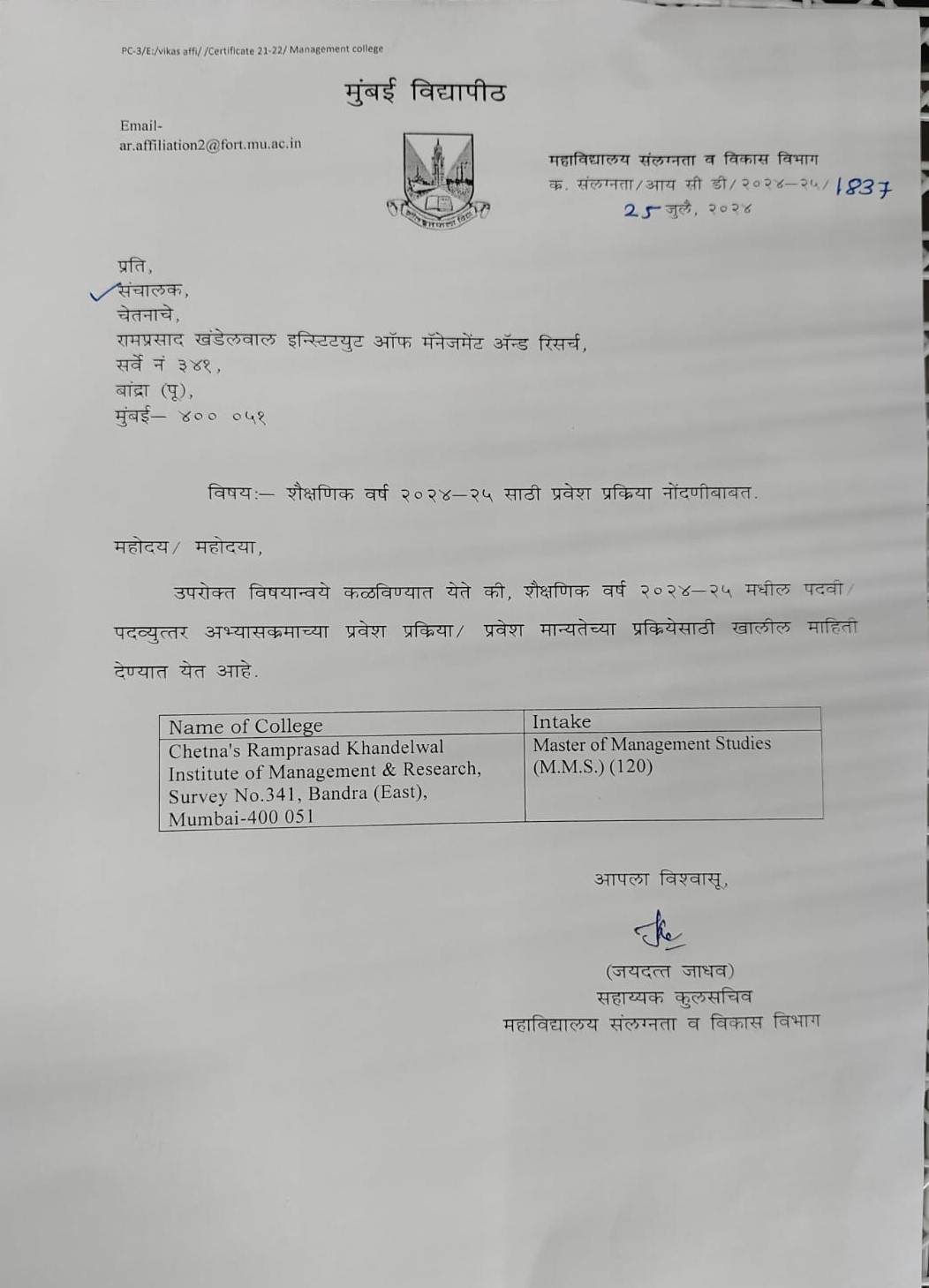 2. Appeared for the Common Entrance Test (MAH-MBA/MMS-CET), conducted by competent authority OR appeared for any other examination like CAT, MAT, CMAT as mandated by the competent authority.
